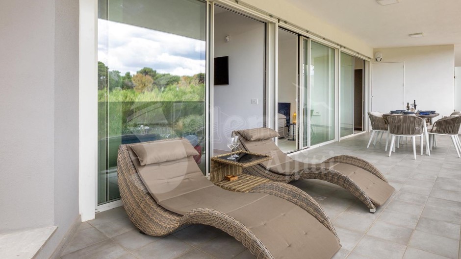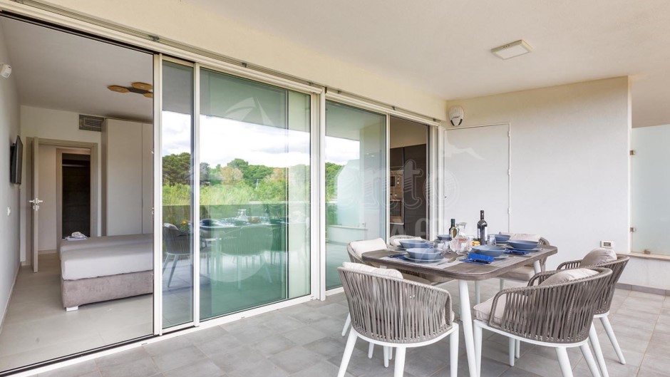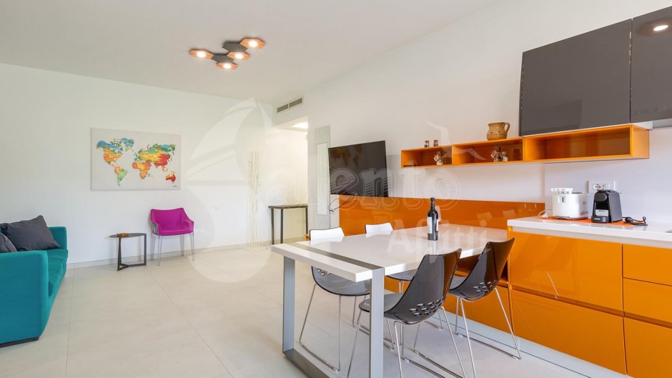 Il soggiorno, ampio e luminoso, presenta una zona pranzo, un comodo divano letto matrimoniale e una cucina a vista. Dalle grandi vetrate si accede alla terrazza arredata con tavolo, sedie e sdraio, dove potrai godere di momenti di relax all'aperto.