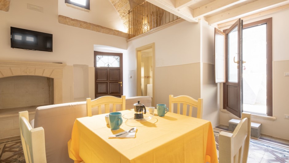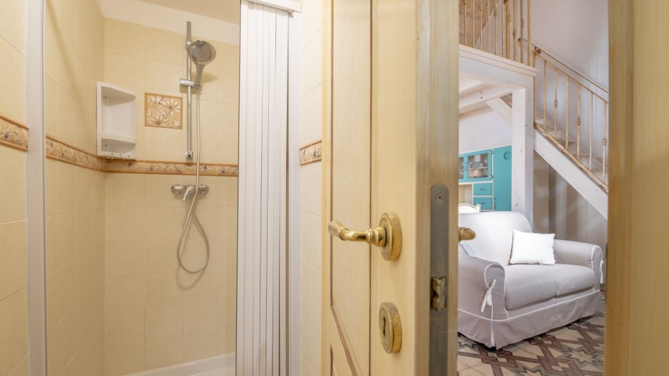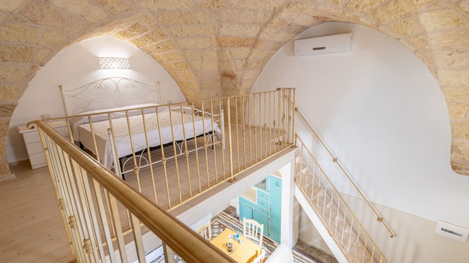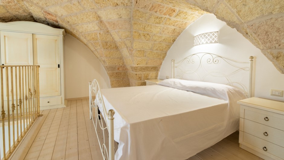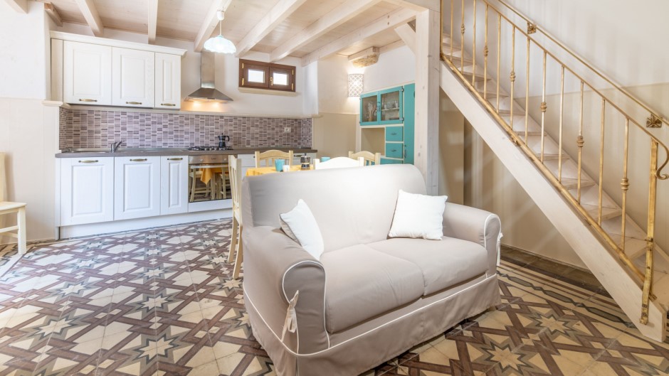 La zona notte si trova su un romantico soppalco, con un letto matrimoniale posizionato sotto la volta a stella, per una notte indimenticabile. Al piano inferiore si trova un ampio soggiorno luminoso e confortevole con una cucina moderna e funzionale, perfetta per preparare pasti durante la vacanza. Il bagno con box doccia è moderno e attrezzato.