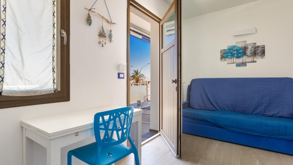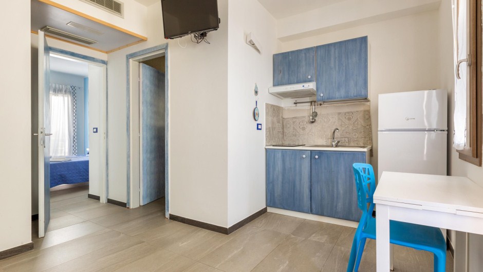 Sistemazione in bilocale: soggiorno con angolo cottura e divano letto per due persone, 1 camera matrimoniale, aria condizionata, tv e bagno doccia privato,