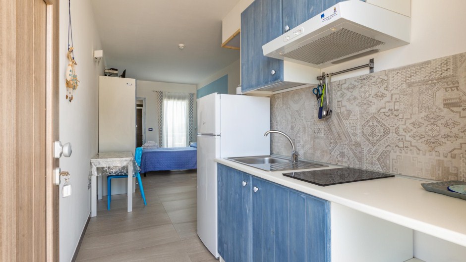 Sistemazone in monolocale: letto matrimoniale + letto doppio a estrazione, cucina, bagno privato, doccia, zanzariera (finestra del bagno)