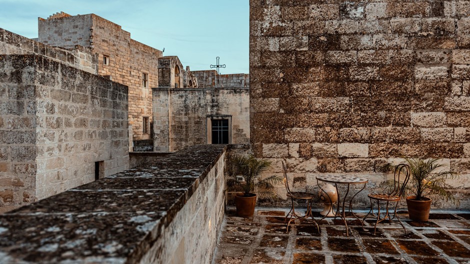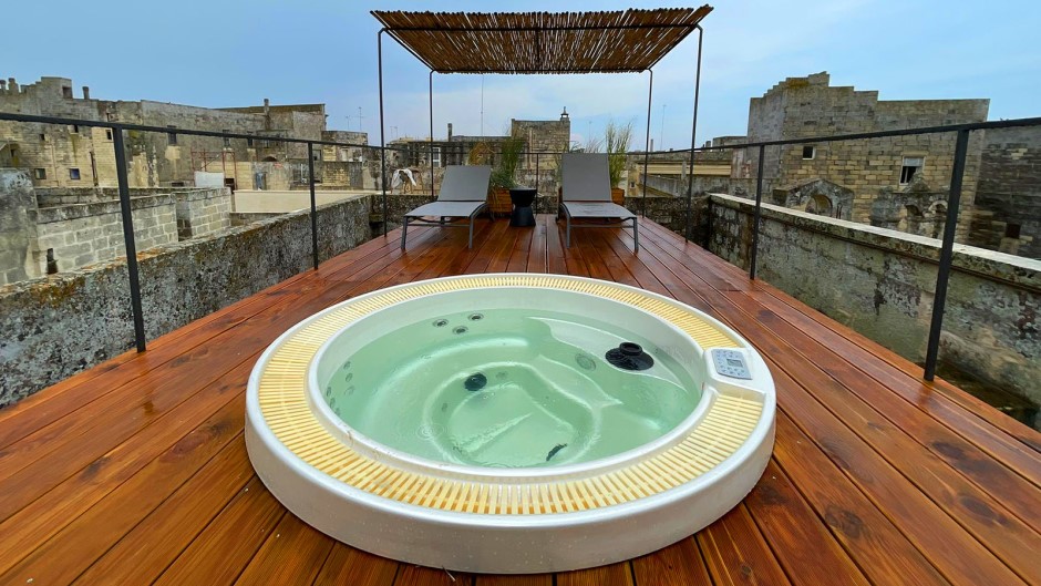 L'unicità di questa Suite è il solarium privato da cui si accede direttamente dalla stanza, con una piccola piscina pensata per due ospiti, da dove godere il panorama suggestivo dei tetti di Maglie.