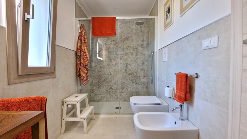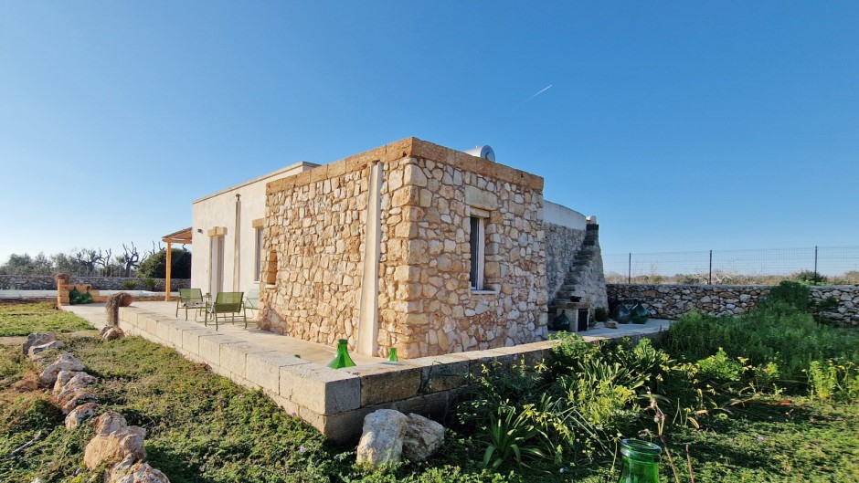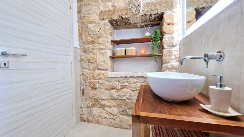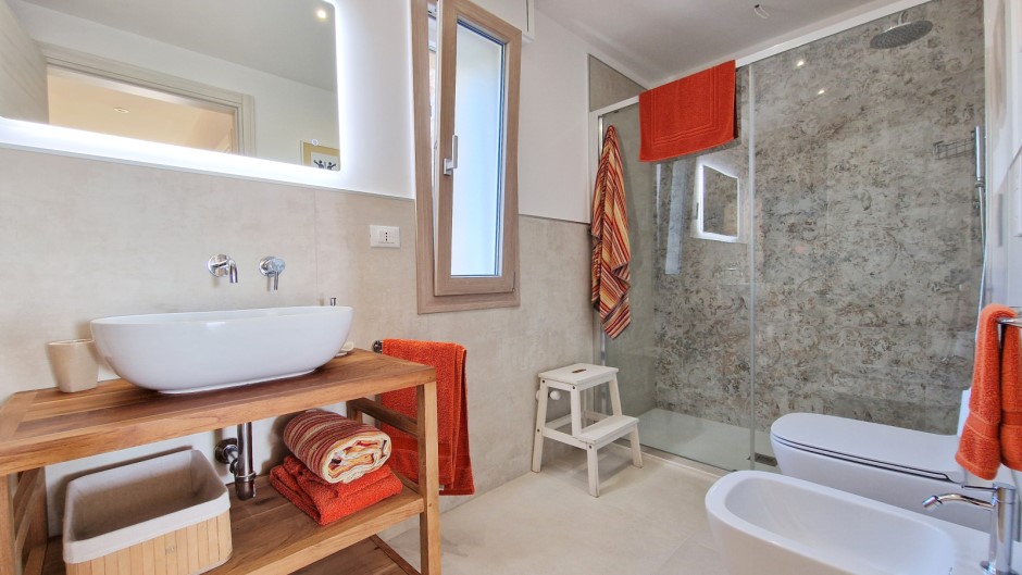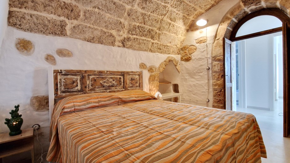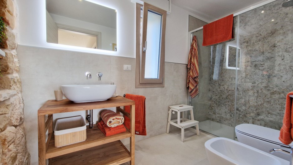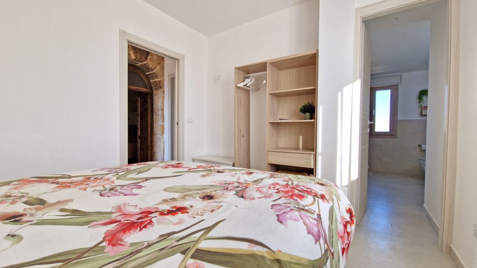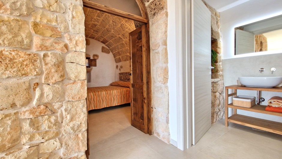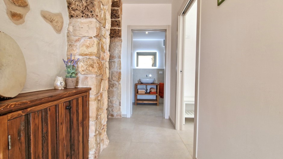 La zona notte è composta da due ambienti caratteristici: la prima camera, ricavata dalla storica Pajara, conserva le suggestive pareti in pietra e il soffitto a botte, creando un’atmosfera che fonde storia e modernità; la seconda camera, dal design contemporaneo, dispone di un elegante bagno privato e di una finestra panoramica che inonda l’ambiente di luce naturale, offrendo una vista rilassante sul giardino. Il bagno principale, studiato per esaltare il perfetto equilibrio tra rustico e moderno, è dotato di una spaziosa doccia con box in cristallo, lavabo con specchio, wc e bidet, completato da mensole in legno grezzo che aggiungono un tocco di autenticità.