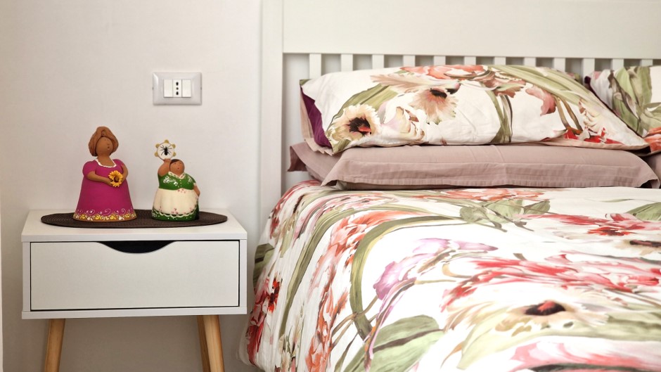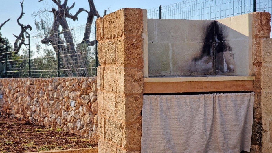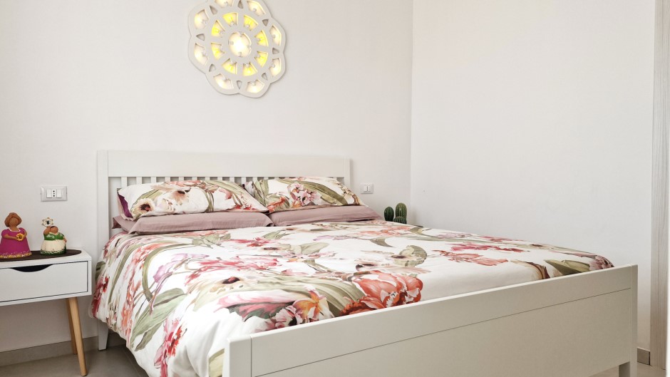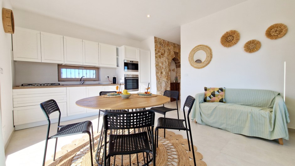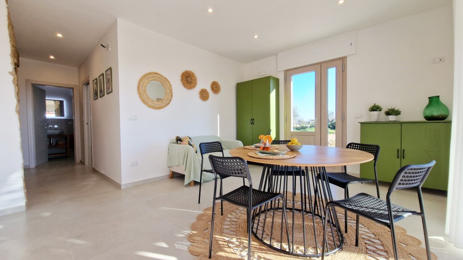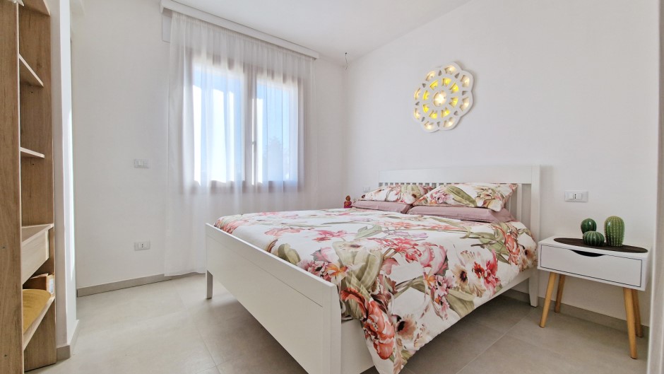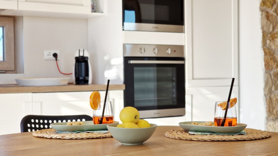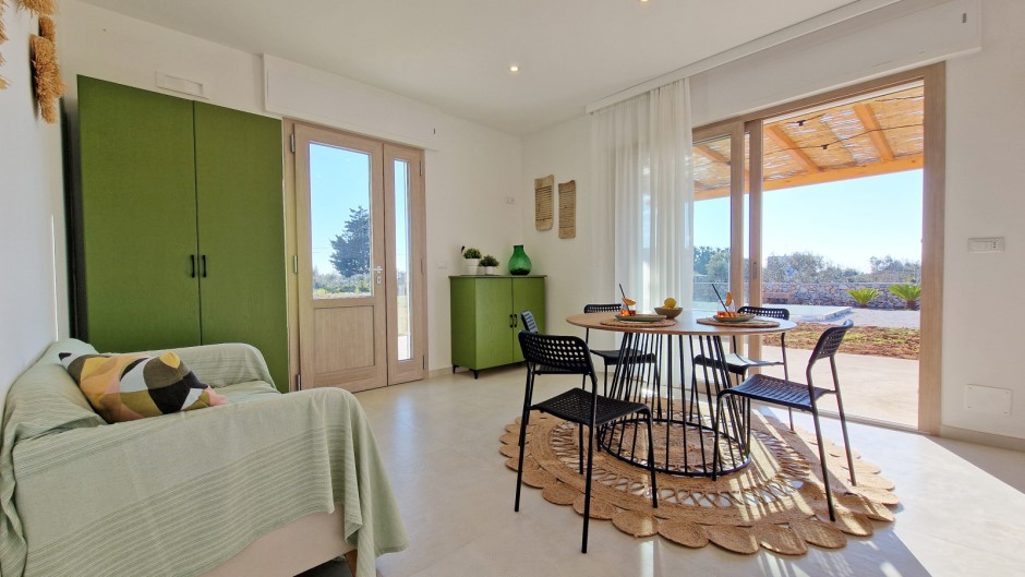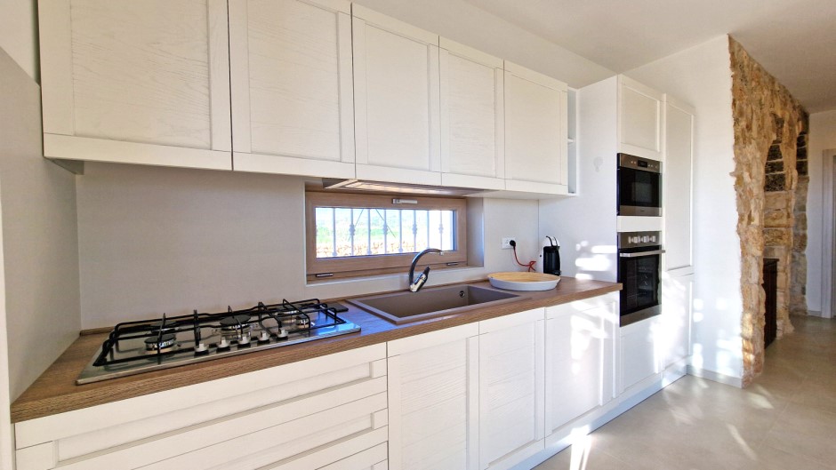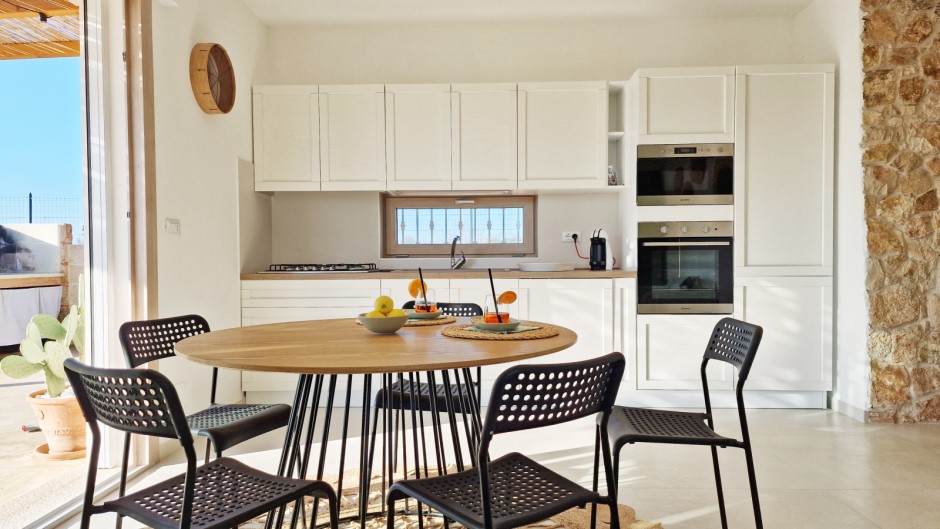 La zona notte è composta da due ambienti caratteristici: la prima camera, ricavata dalla storica Pajara, conserva le suggestive pareti in pietra e il soffitto a botte, creando un’atmosfera che fonde storia e modernità; la seconda camera, dal design contemporaneo, dispone di un elegante bagno privato e di una finestra panoramica che inonda l’ambiente di luce naturale, offrendo una vista rilassante sul giardino. Il bagno principale, studiato per esaltare il perfetto equilibrio tra rustico e moderno, è dotato di una spaziosa doccia con box in cristallo, lavabo con specchio, wc e bidet, completato da mensole in legno grezzo che aggiungono un tocco di autenticità.