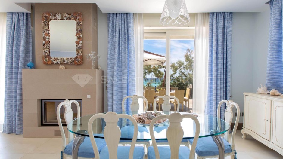 La bella Villa Bianca si trova sulla spiaggia, lungo il litorale di Torre Castiglione, località che si trova poco a nord di Torre Lapillo, nel territorio di Porto Cesareo.