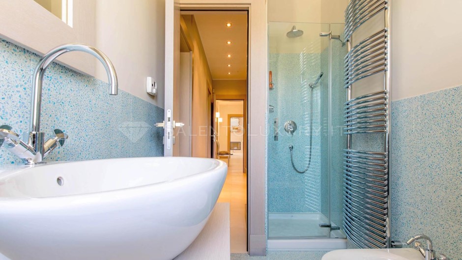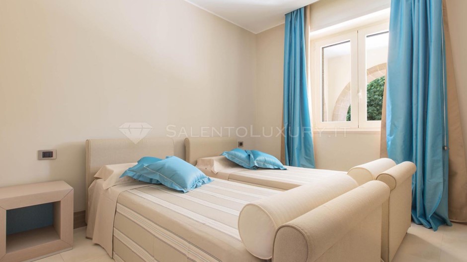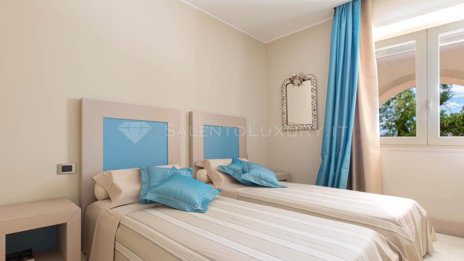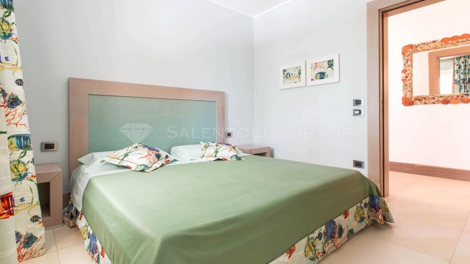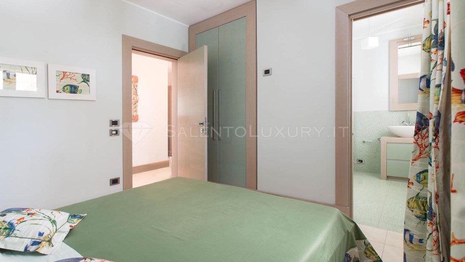 La zona notte si trova lungo un disimpegno che la separa dal soggiorno. Vi sono 1 camera matrimoniale verde acqua con bagno en suite, e 2 camere doppie con letti vicini, servite da bagno doccia in comune.