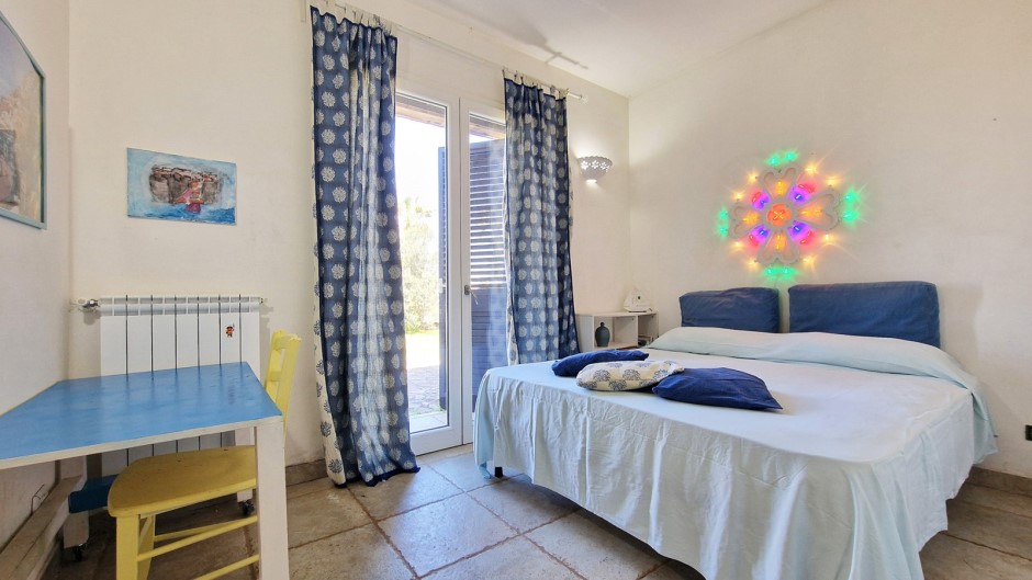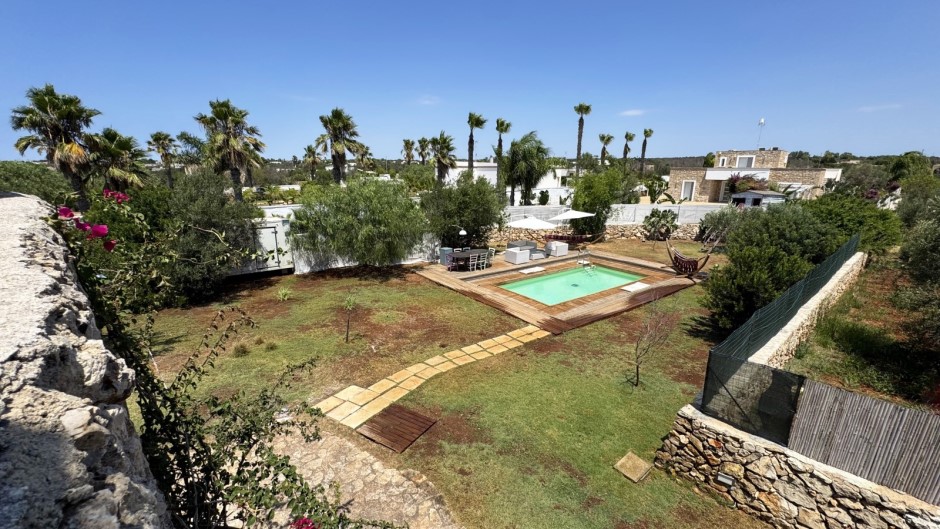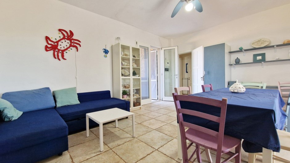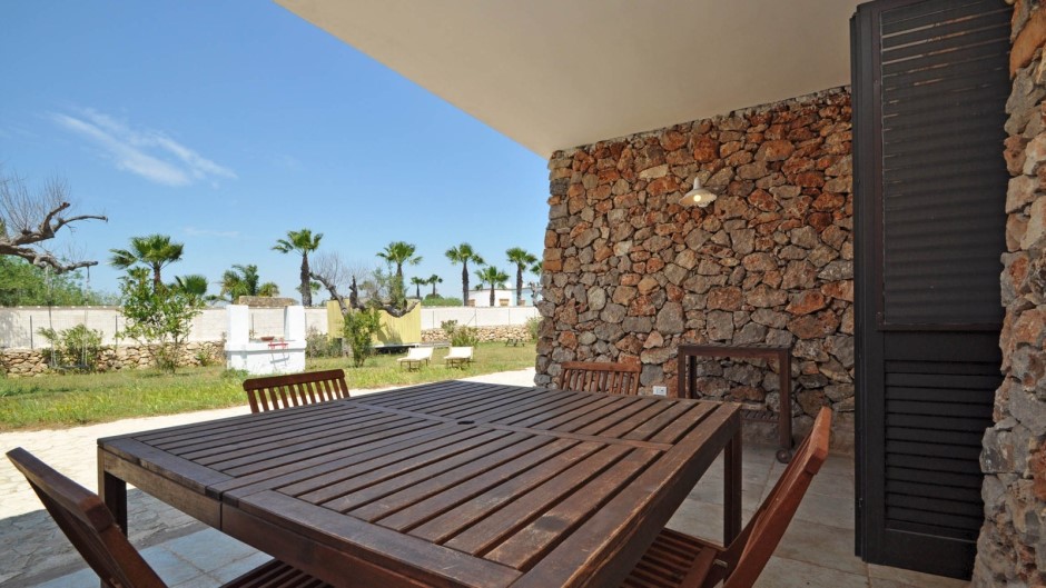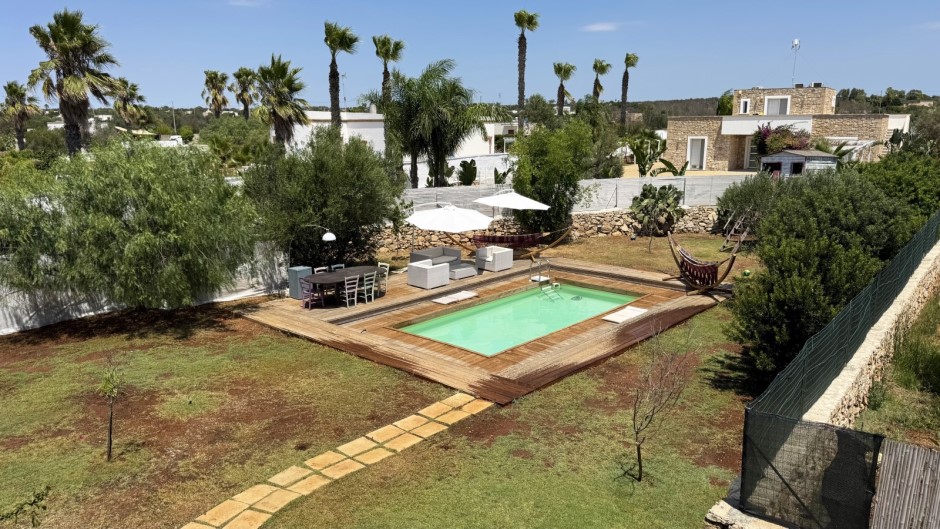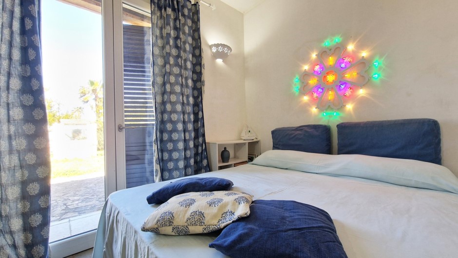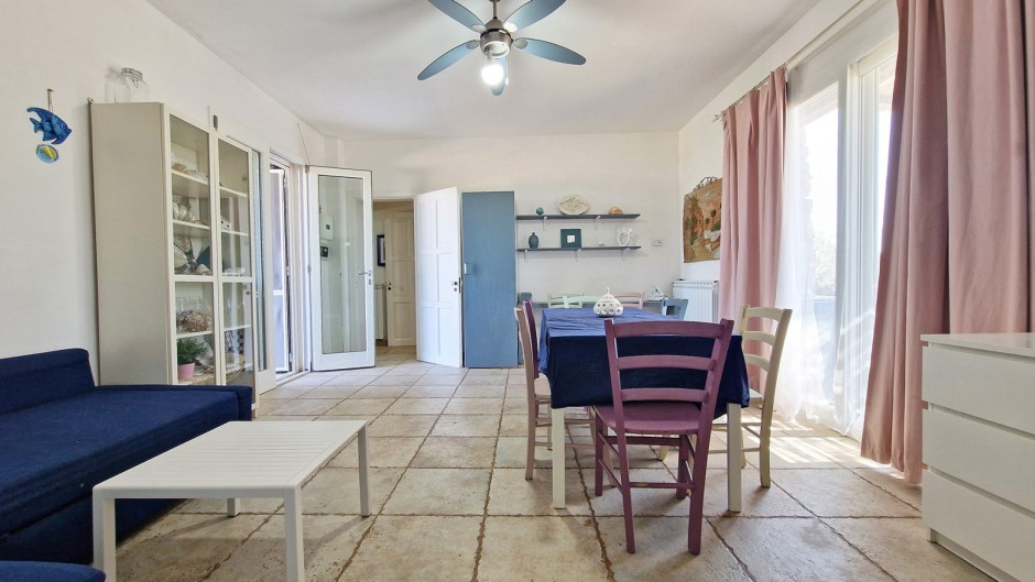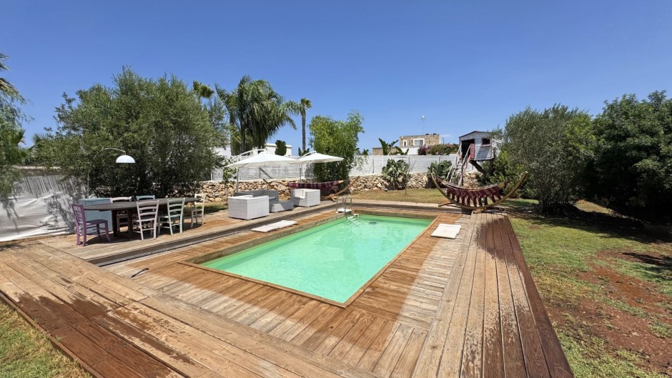 La villa a piano terra, ampia e luminosa, è arredata con gusto e semplicità e gode di una spaziosa zona living con vetrate scorrevoli, tavolo da pranzo, divano e tv a schermo piatto, una cucina abitabile, 3 camere da letto, di cui 2 matrimoniali e 1 con letto matrimoniale e letto singolo, e due bagni con doccia. Esternamente, la casa gode di una veranda in muratura e di un patio attrezzati con mobili da giardino per pranzi e cene all'aperto. Inoltre sono presenti zanzariere su tutte le porte e finestre.