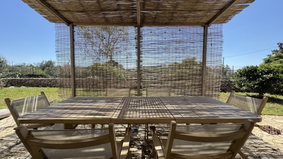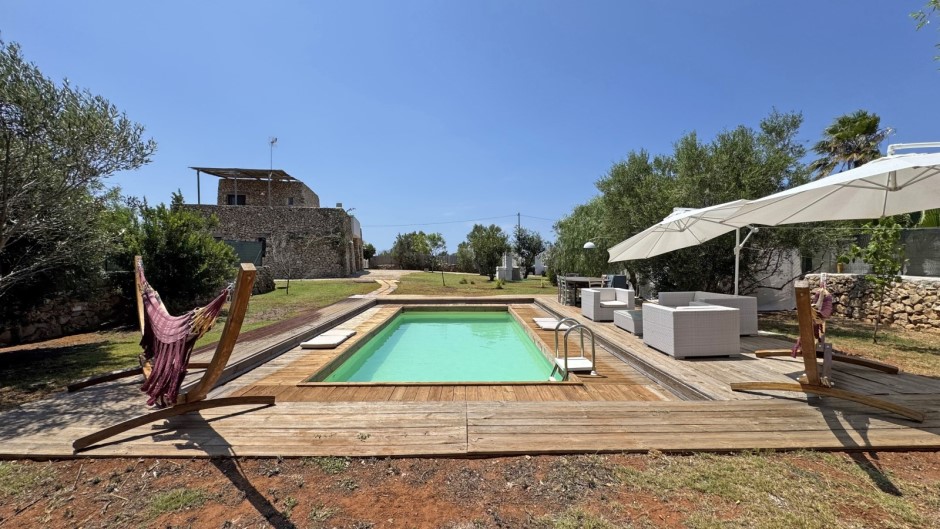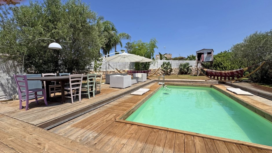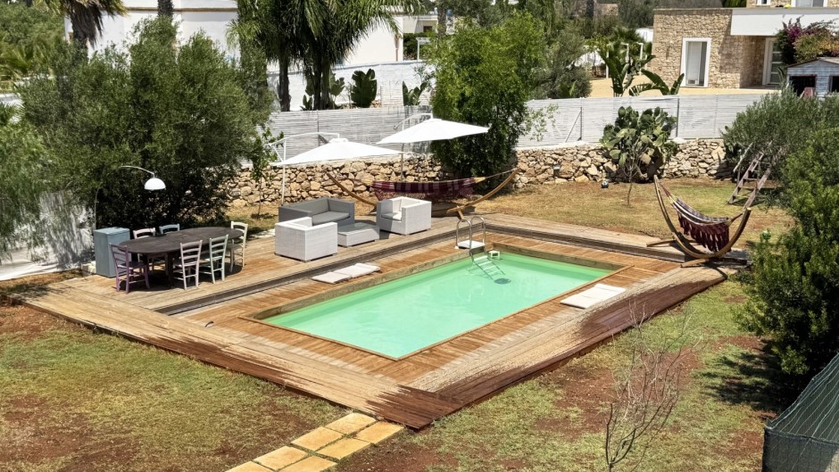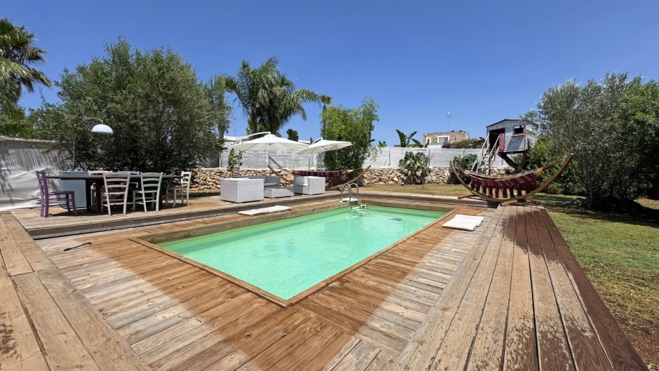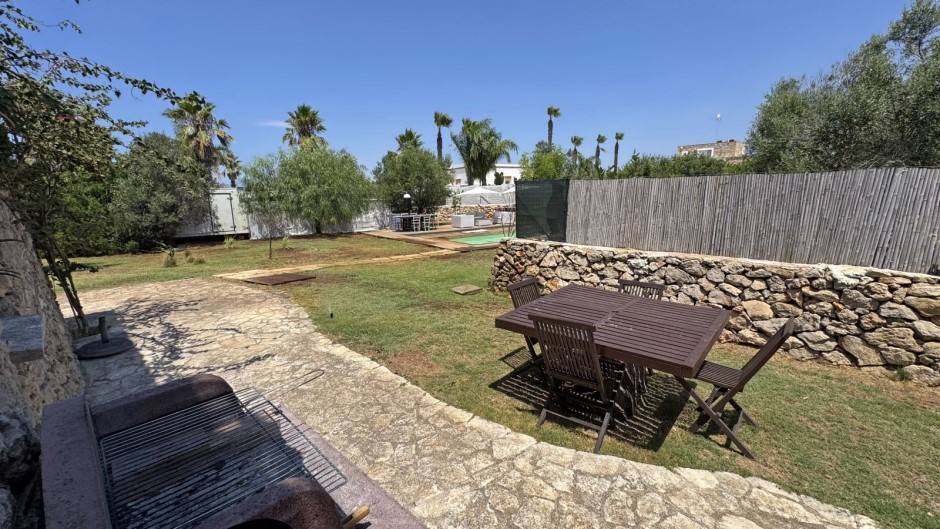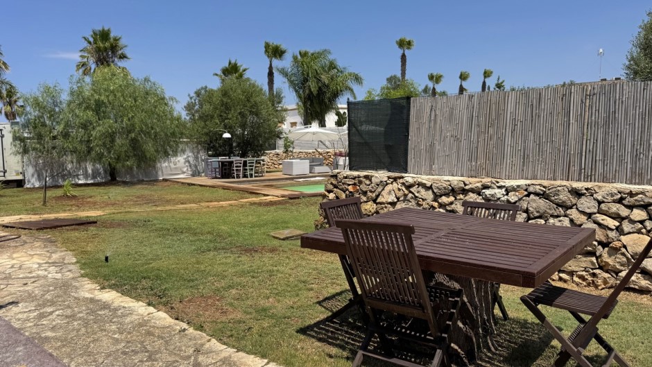Il giardino, completamente recintato, è caratterizzato da bellissimi alberi di ulivo e piante tipiche mediterranee ed è arredato con lettini, barbecue e mobili da esterno. Inoltre, offre una zona dedicata ai più piccoli con una graziosa casetta sull'albero e delle giostrine.