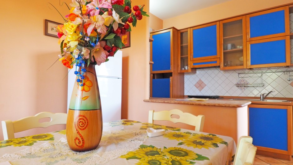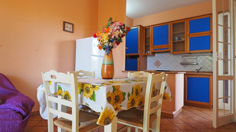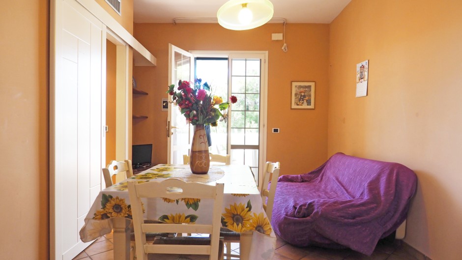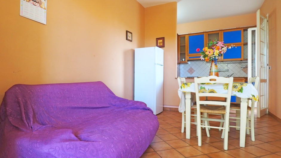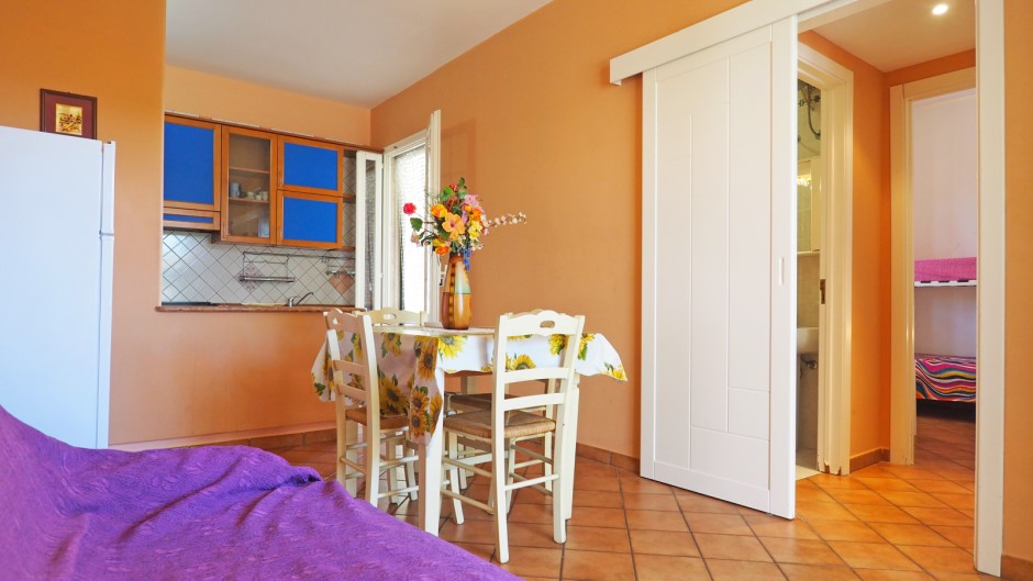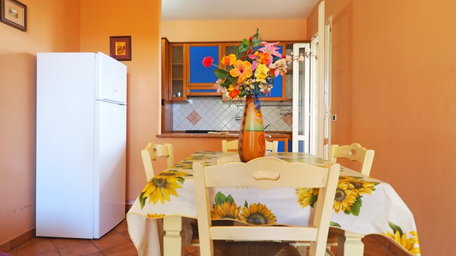 L'interno offre una luminosa sala da pranzo con angolo cottura, perfetta per preparare e gustare deliziosi pasti in compagnia.